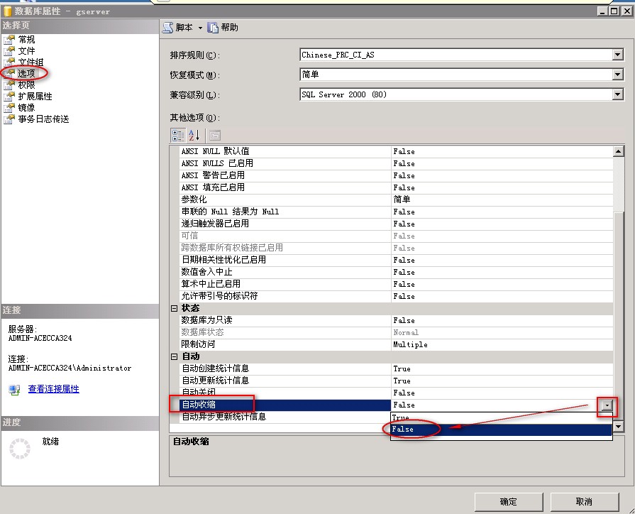 2,在数据库属性“选项”中,在“自动—》自动收缩”项,选择"False" 点击“确定”就可以了,如下图: