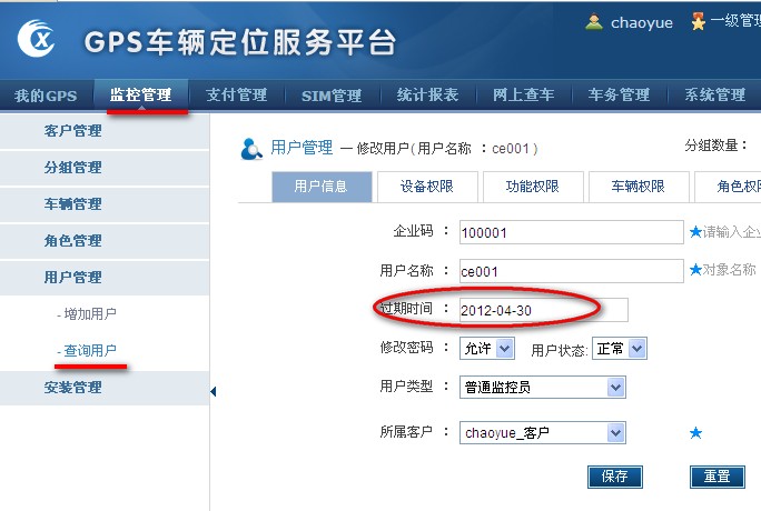 用上级管理员登陆后台管理,监控管理,查找用户,在修改用户页面修改用户的有效期,如下图